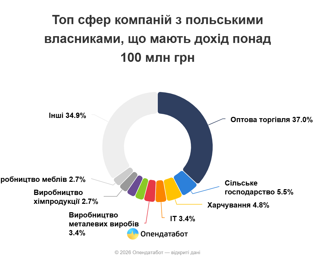 Понад третина польських компаній із доходом понад 100 млн грн працює у сфері оптової торгівлі — 54 бізнеси. Наслідує сфера сільського господарства (8), харчування (7), ІТ та виробництва металевих виробів — по 5 компаній у кожній сфері.