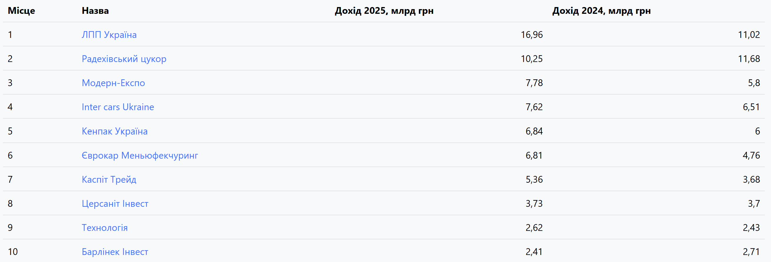 Лідером стала компанія «ЛПП Україна», яка управляє відомими брендами одягу Reserved, Cropp, House, Mohito та Sinsay. Її дохід сягнув майже 17 млрд грн. Далі у рейтингу «Радехівський цукор» із понад 10 млрд грн.