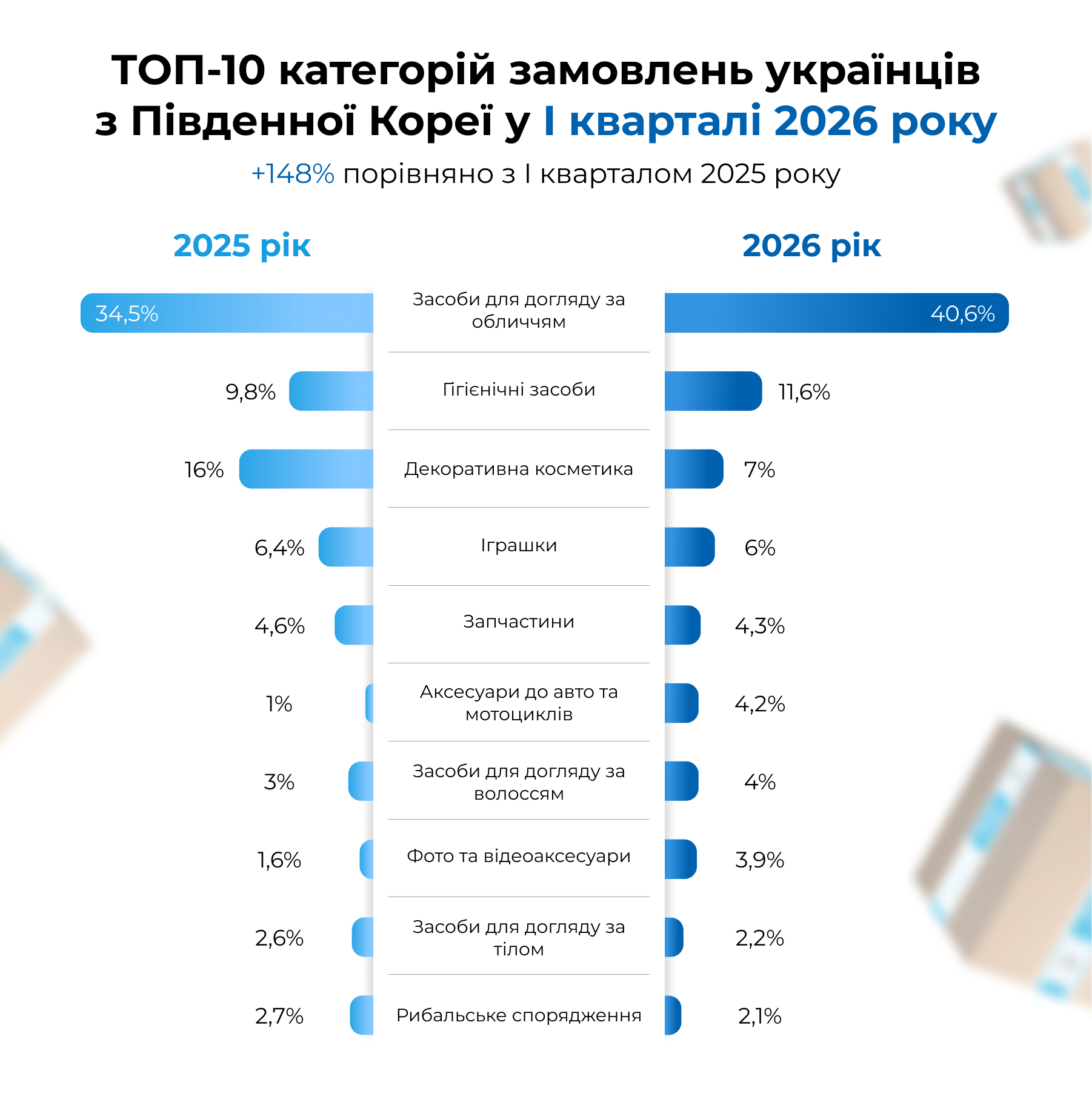 Найбільшою популярністю з року в рік користується категорія засобів для догляду за обличчям — 40,6% усіх замовлень у 2026 році проти 34,5% у 2025 році. Саме завдяки своїм beauty-продуктам Південна Корея прославилася на весь світ. Тому в ТОП-10 і інші категорії, пов’язані з доглядом та макіяжем: гігієнічні засоби (11,6%), декоративна косметика (7%), засоби для догляду за волоссям (4%) та засоби для догляду за тілом (2,2%).