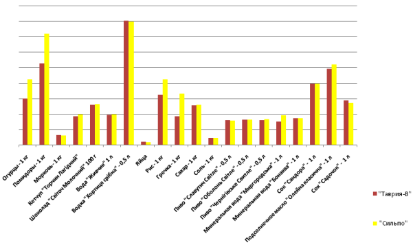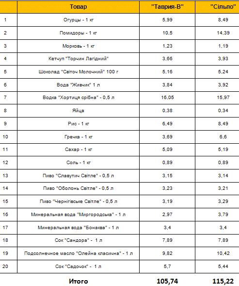 Если взять сумму цен товаров с таблицы, то общая сумма покупки на 20 выбранных товаров составляет 105,74 грн в “Таврии-В” и 115,22 грн - в “Сільпо”. Следовательно, делать покупки в «Таврии-В» на 8,2% дешевле, чем в «Сільпо».