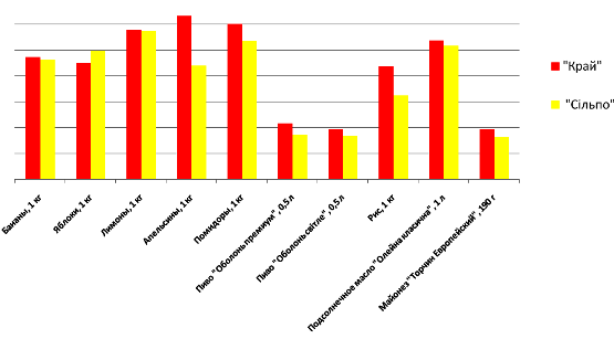 Если взять сумму цен товаров с таблицы, то общая сумма покупки на 10 выбранных товаров составляет 86,20 грн в “Крае” и 77,09 грн - в “Сільпо”. Следовательно, делать покупки в «Крае» на 11,8% дороже, чем в «Сільпо».