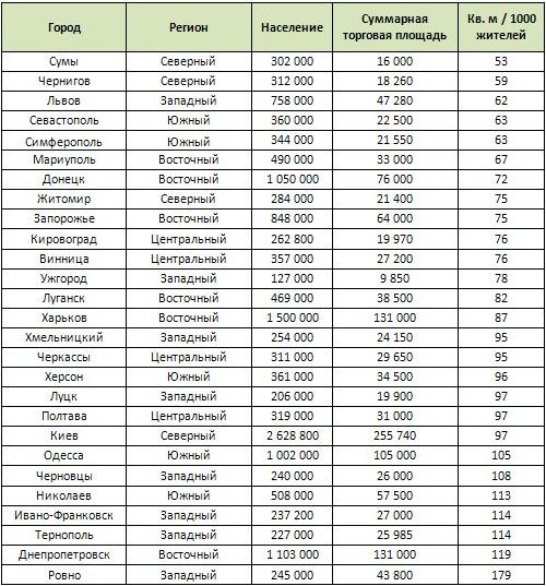 Наименее насыщенными оказались северные города Сумы (53 кв.м./1000 жителей) и Чернигов (59 кв.м. / 1000 жителей), а также Львов (62 кв.м/1000 жителей).
