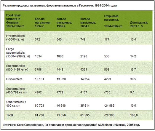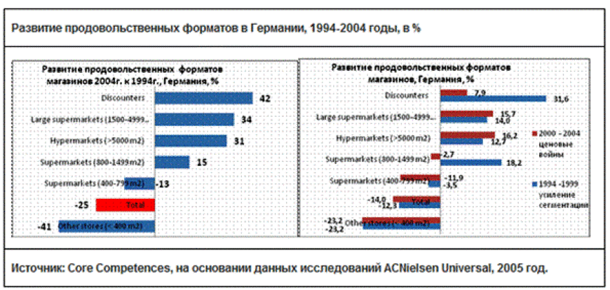 Наиболее наглядно завершающий этап эволюции форматов магазинов можно проследить на зрелом рынке Германии в период с 1994 по 2004 год, когда в первой «пятилетке» (1994-1999 год) продолжилось усиление сегментации торговли, а во второй «пятилетке» (2000-2004 год) прошли жесточайшие ценовые войны, связанные с выходом Wal-Mart на рынок Германии. В каждую «пятилетку» общее количество магазинов сокращалось примерно на 10 тыс. Однако в разрезе открывшихся и закрывшихся точек продаж картина выглядит иначе: в период с 1994 по 1999 год закрылось 14 228 магазинов (из них 14 055 – форматы менее 400 кв. м), а открылось 4184 магазина (из них 3197 – дискаунтеры); в период с 2000 по 2004 год закрылось 11 518 точек продаж (10 834 – это самый малый формат), а открылось только 1335 (1026 – дискаунтеры). То есть в период ценовых войн открылось магазинов на 68%, а закрылось почти на 20% меньше, чем в период, предшествующий ценовым войнам. При этом розничный рынок FMCG товаров вырос почти на 25% в отпускных ценах и на 5% в номинале, а общее количество торговой площади увеличилось на 1,5 млн кв. м.