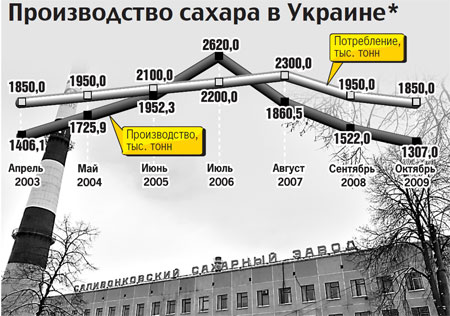 Есть и еще одна причина. Как сообщили нам в компании «Укррос», производящей сахар, в течение последних двух лет дотации на посевы сахарной свеклы не выплачивались. Сократилось кредитование сельского хозяйства, поэтому удобрений в прошлом году закупили меньше - около 35 процентов от нормы. Это привело к резкому снижению урожайности, и сахарной свеклы собрали на 23 процента меньше объемов 2008 года.