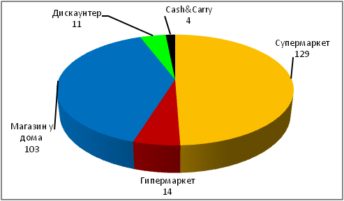 Если говорить о представленных в Киеве форматах продовольственных магазинов, то ровно половина столичных торговых точек работают в формате «супермаркет», который проповедуют 15 торговых сетей. На втором месте по количеству магазинов идет розничный формат «магазины у дома», в котором работают 7 торговых сетей. В самом крупном и наиболее дорогом формате – «гипермаркет» в Киеве работают 5 сетей (Auchan, Rainford, «Мегамаркет», «Караван» и «Країна»), которые в сумме представлены 14 магазинами (правда, еще некоторые торговые сети, работающие в формате «супермаркет», имеют в своем составе магазины, по всем параметрам подходящие под гипермаркеты).
