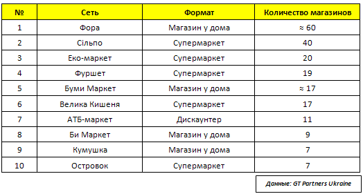 На сегодняшний день в Киеве насчитывается порядка 260 современных продовольственных магазинов, которые представляют 30 разных торговых сетей. Самыми многочисленными из них являются торговые сети компании Fozzy Group – «Фора» (около 60 магазинов) и «Сільпо» (40 магазинов). Довольно далеко от них отстали «ЕКО-Маркет» (20 супермаркетов) и «Фуршет» (19 супермаркетов).