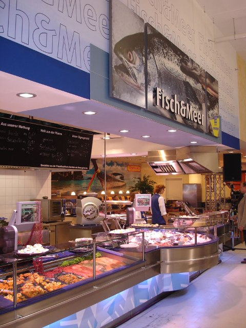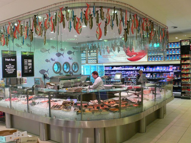 Сеть универмагов Galeria Kauhof (сейчас она принадлежит METRO Group) уже более 130 лет работает в Германии во всех крупных городах. Сегодня в сети 141 супермаркет в Германии и Бельгии, торговый оборот составляет 3,5 млрд. евро. Для Galeria Kauhof характерны динамизм, креативность и постоянные измения к лучшему. На цокольном этаже каждого универмага компания располагает свой деликатесный супермаркет. Сеть придерживается концепции инновационного дизайна, и старается сделать магазин стильным и эмоционально продавать ассортимент. Посмотрите на рыбный отдел в магазине Galeria Kauhof в Берлине. С одной стороны, он инновационный – использовано новейшее, качественное оборудование и для выкладки рыбы на льду, и для нарезки, взвешивания, обработки рыбы. С другой стороны, отдел эмоциональный. Он интесно оформлен – силуэты рыб на стеклянном фризе и кафельной мозаике придают отделу изюминку. И конечно, здесь отличный ассортимент и богатый выбор свежей рыбы и морепродуктов.