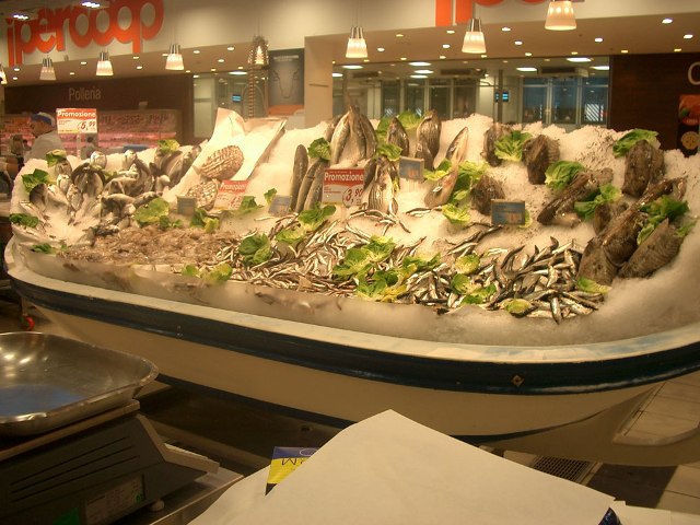 Еще одна цель сети - не быть такими как другие магазины, отличаться, иметь свое лицо. Посмотрите на рыбу на льду в гипермаркете IPERCOOP. Такое может себе позволить не каждая сеть. Целые лодки, наполенный льдом, предлагают огромный выбор рыбы и морепродуктов покупателям. Мимо такого выбора просто невозможно пройти, тем более что лодки стоят на одном из главных проходов в гипермаркете и логически завершают фантастический рыбный отдел.