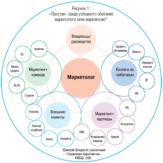 Сообразно описанной выше схеме работы маркетинга украинского «Голден Телекома» у нас вырисовывается непростая картина среды успешного обитания маркетолога (в данном случае маркетинг-менеджера или директора) в корпоративном мире (рис. 1).