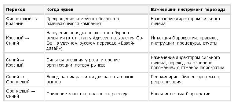 А теперь сборник рецептов: когда имеет смысл добиваться перехода с одного уровня на другой и как это делать. Обратите внимание: в природе выживает не самый сильный, а самый приспособленный. Поэтому задача состоит не в том, чтобы перейти на самый высокий из возможных уровней, а в том, чтобы найти самый подходящий для вашей компании, исходя из отрасли, размера, этапа жизненного цикла, «цвета» руководителей и сотрудников, ситуации на рынке. Ниже мы рассматриваем только наиболее распространенные типы переходов. Понятно, что эта схема слишком упрощена, детально все механизмы описаны в упомянутой книге Адизеса.