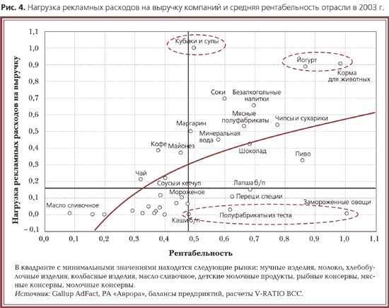 Во-вторых, существует несколько рынков, которые выделяются из главного тренда. Так, рынки кормов для животных, бульонных кубиков и сублимированных супов находятся на стадии активного роста, но состав их участников (транснациональные компании) предопределил избыточный характер рекламных расходов (и «атакующих», и «оборонительных»). Пока для операторов рынка кормов для животных складывается довольно благоприятная ситуация, а операторы рынка бульонных кубиков и сублимированных супов уже почувствовали недостатки такой политики — их рентабельность снизилась.
