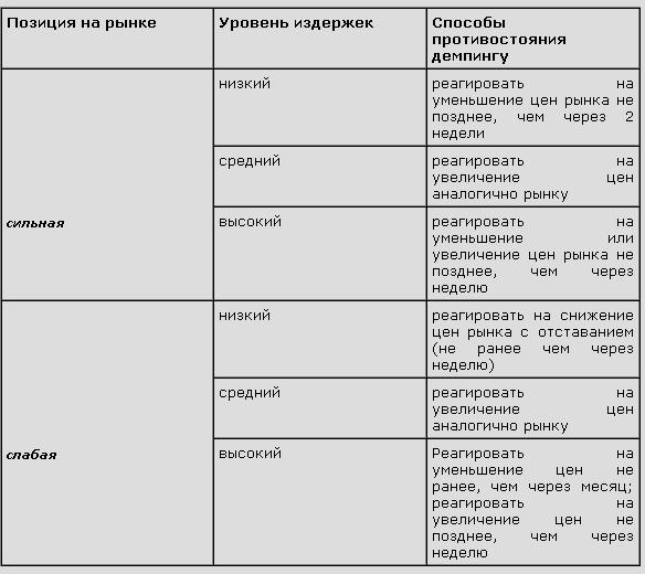 Обычно начинающая компания, узнав о снижении цен конкурентами, принимается искать какие-то решения проблемы демпинга, как правило, не приносящие желаемых результатов. В данном случае фирме необходимо иметь систему конкурентного анализа, чтобы не быть застигнутой врасплох. Такой анализ показывает, что демпинг в краткосрочной перспективе не может быть выгодным, так как продукт реализуется по ценам, ниже сложившихся.