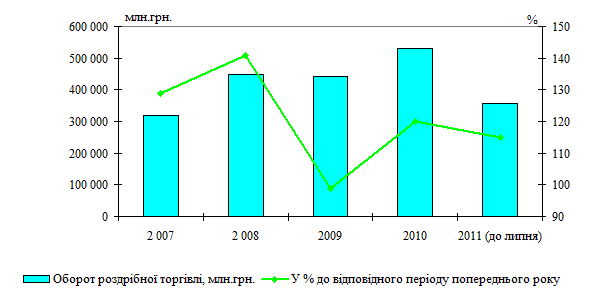 За даними Держкомстату, в 2010 р. обсяг роздрібного товарообігу України становив 529,9 млрд. грн., що в порівняльних цінах на 7,6% більше від обсягу попереднього року [2].
