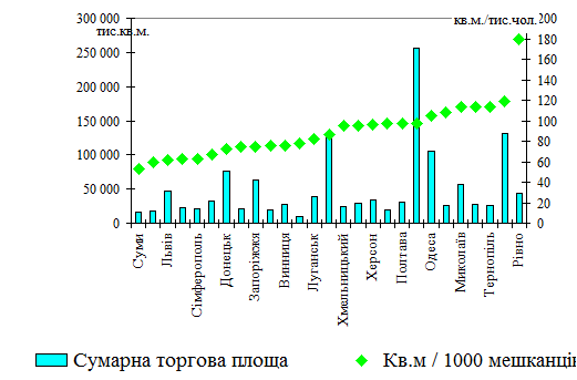 У середньому забезпеченість торговельними площами на тисячу населення в Україні становить 89,88 кв.м, у той час, як в Європі цей показник складає 198 кв.м. Найбільша насиченість спостерігається у Західному регіоні (середній показник 106 кв.м/тис.чол.), що зумовлене високою концентрацією торгових площ у Рівному (179 кв.м./тис.чол.), найменша – в Північній Україні (71 кв.м/тис.чол.). Найгірші показники насиченості спостерігаються у Сумах (53 кв.м./тис.чол.). У Львові на тисячу мешканців припадає 62 кв.м. торгових площ продовольчих мереж.
