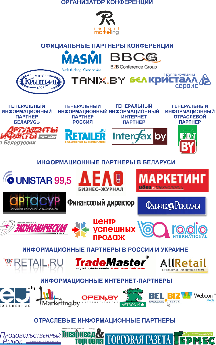 В числе докладчиков Конференции и ведущих мастер-классов – генеральный директор группы компаний Advanter Group Андрей Длигач (Украина), основатель Retail in Detail Сергей Леонов (Россия), генеральный директор информационного агентства «Интерфакс-Запад» Наталья Крашевская (Беларусь), директор консалтинговой компании «РитейлМаркетинг» Татьяна Закжевская (Беларусь), директор международного исследовательского агентства «МАСМИ» в Беларуси Татьяна Лисицкая, начальник отдела факторинга «Приорбанк» Руслана Клевжиц (Беларусь), основатель Агентства исследования и предотвращения потерь Игорь Чумарин (Россия), директор интернет-компании «Таникс» Игорь Горлатов, директор по персоналу торговой сети «Палас» Наталья Щерба, Партнер компании 495Design, дизайнер Василий Андреев.
