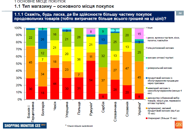 Крупные гипермаркеты становятся все более популярным форматом магазинов в странах Центральной и Восточной Европы. В то же время, их доля в Украине составляет лишь 8%, а основным местом покупок у нашего населения являются супермаркеты. Среди важнейших характеристик магазина жители большинства европейских стран выделяют наличие скидок и специальных предложений, украинцы же называют близость расположения и низкие цены. Об этом свидетельствуют результаты исследования Shopping Monitor CEE 2012, проведенного в октябре-ноябре 2011 года в 10 странах Центральной и Восточной Европы компанией GfK.