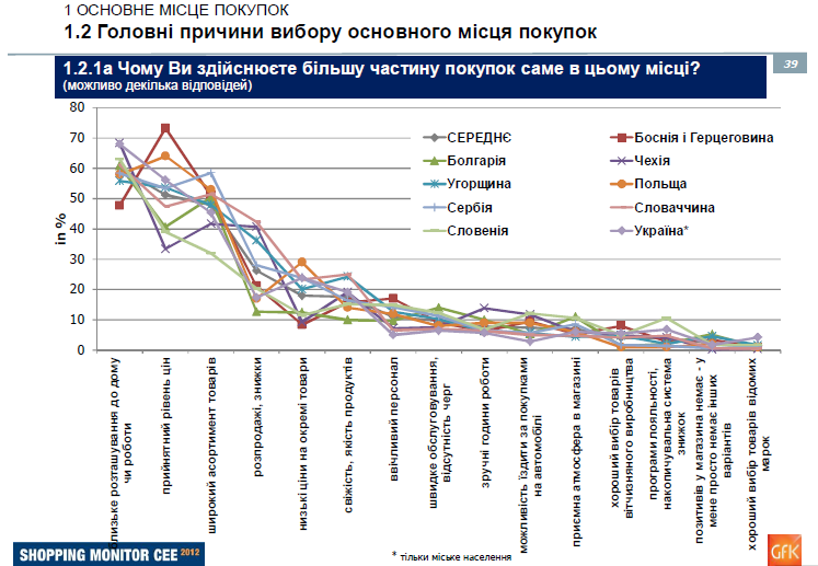 На вопрос, почему респондент выбрал конкретный магазин, большинство респондентов во всех странах назвали такие факторы, как приемлемые цены, широкий ассортимент товаров, а также наличие скидок и распродаж в торговой точке. Украинские жители больше граждан других стран региона ценят близкое расположение (около 70% выбрали этот вариант), а также низкие цены на отдельные товары (около 24%). В то же время, более спокойным является их отношение к таким характеристикам, как широта ассортимента, скидки и распродажи, вежливость персонала, режим работы и возможность ездить за покупками на автомобиле.