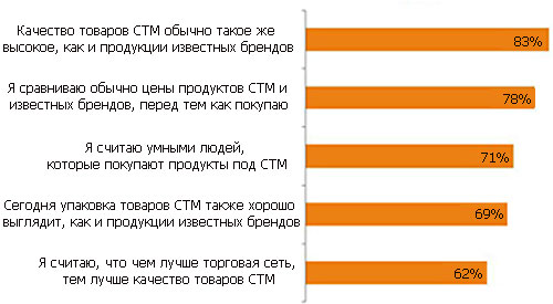Для того, чтобы привлечь клиентов и повысить маржу, многие торговые организации ставят на собственные торговые марки (СТМ) как хорошо проверенное средство (см. График 2). 83% потребителей убеждены, что качество товаров под СТМ обычно такое же хорошее, как и продукции под известными торговыми марками. В зависимости от товарной группы существуют, однако, сильные различия в поведении покупателей: бумажные средства гигиены под СТМ покупали 82% потребителей, как минимум, 1 раз. Что касается детского питания под СТМ, доля покупателей составила лишь 8%.