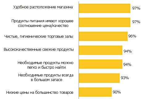Однако чистые, гигиенические торговые залы (96%), наличие всех необходимых продуктов в одном магазине (94%), а также возможность быстро и просто найти необходимые продукты (94%) играют также очень большое значение.