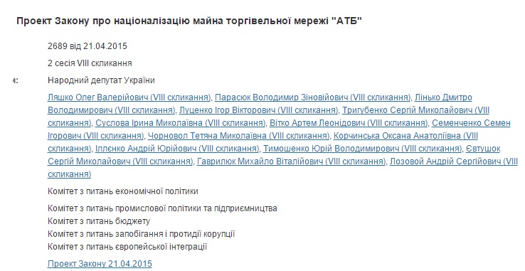 Поздно вечером 21 апреля 15 народных депутатов, большая часть которых представляет Радикальную партию Олега Ляшко, зарегистрировали в Верховной Раде скандальный законопроект №2689 под названием "О национализации имущества торговой сети АТБ".