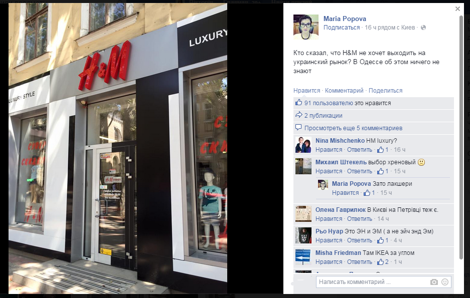 Например, в Одессе работают торговые точки H&М и IKEA. Такие магазины встречаются не только в Одессе, но и в Киеве. А в Харькове пару лет назад на крупнейшем украинском рынке «Барабашова» работал «фирменный магазин» Hugo Boss - пишет ABC News