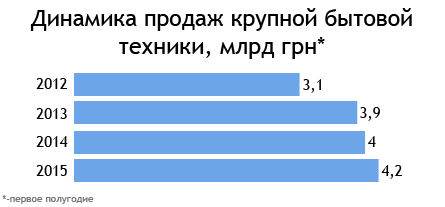 Продажи крупной бытовой техники существенно не отличаются от среднерыночных. За шесть месяцев этого года, по данным Эльдорадо, стиральных машин, холодильников, кондиционеров, встраиваемой техники и пр. продано на 4,2 млрд грн, что на 4% превышает аналогичные показатели 2014 г. Статистика свидетельствует, что украинцы готовы покупать лишь товары, без которых не могут обойтись. Например, это может быть новый холодильник или посудомоечная машина. Во многих крупных городах наблюдается интересная тенденция: украинцы отказываются от встраиваемых духовок и используют освободившееся место для посудомоечной машины.