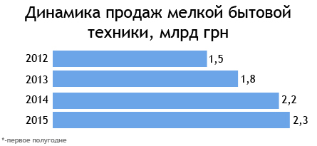 Мелкой бытовой техники в январе-июне этого года реализовано на 2,3 млрд грн, что на 4% больше по сравнению с прошлым годом. Самым "большим" является сегмент мультиварок, объем продаж которых в первом полугодии составил 500 млн грн. Это на 20% меньше по сравнению с таким же периодом прошлого года.