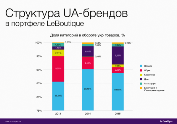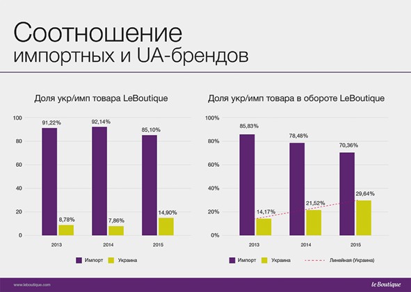 Многие маркеты начали более активно сотрудничать с украинскими производителями, продукция которых выиграет в "конкуренции цен" с импортными аналогами. По словам представителей LeBoutique, пока в Украине предлагается около 90% импортных товаров и только 10% украинских. При этом спрос на последние в два раза выше, чем на иностранные.