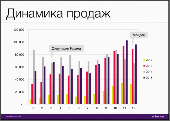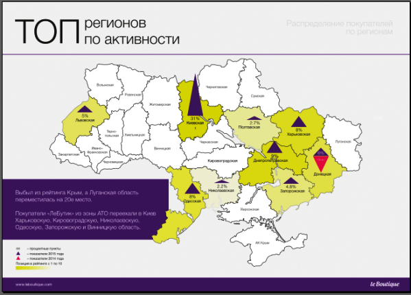 Согласно предоставленным нашему изданию данным LeBoutique, в 2015 году наиболее существенно «ударили» по количеству продаж и доходам интернет-магазинов снижение покупательской способности населения, а также оккупация Крыма и война на Донбассе. По оценке представителей компании, большинство онлайн-маркетов потеряли в продажах от 15 до 30%. Ранее в LeBoutique донецкий регион генерировал от 8 до 15% оборота, занимая второе место по объему продаж после Киева. Покупатели из Крыма делали от 6 до 12% продаж, а луганчане - еще порядка 4-7%.