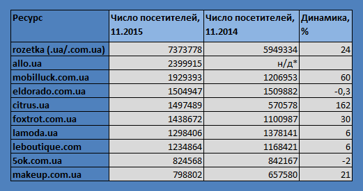 Из прошлогодней десятки лидеров «выпали» bonprix.ua, посещаемость которого снизилась с 1,4 млн в ноябре 2014 до 671 тыс. в ноябре 2015-го, а также fotomag.com.ua, показавший падение с 834 тыс. до 311 тыс.