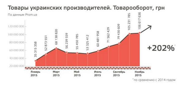 Тренд, который возник в 2015 году и будет особо актуален в 2016-м, - повышенный спрос на товары украинского производства. Более 20% товаров, купленных на Prom.ua c начала года, - от наших производителей. Товарооборот в этом сегменте за год вырос в три раза.