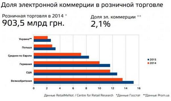 Возможности для роста колоссальные, ведь сегодня доля электронной коммерции в структуре розничной торговли Украины лишь немного превышает 2%. Для сравнения, в Германии - около 12%, США - 13%, в Великобритании - 15%.