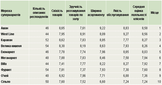 Найбільш лояльними були відвідувачі "Ашану" та мережі супермаркетів West Line. У першому найвищу оцінку отримала ширина асортименту, а в другому - якість обслуговування.