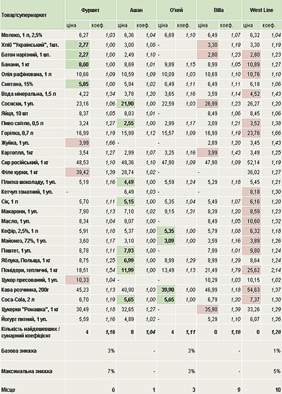 За результатами зрізу, найбільш дешевими виявилися товари у "Каравані", "Ашані" та "О"кеї", що не є дивним, з огляду на великі площі та обороти продажів.