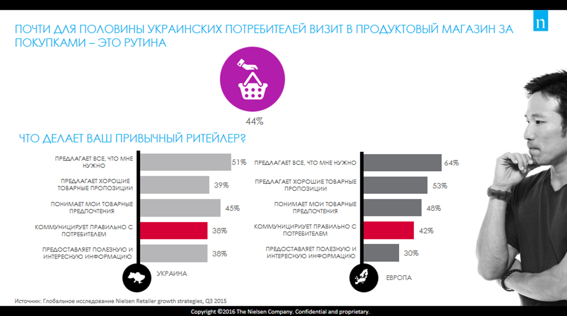 Современный потребитель считает, что в большинстве случаев привычный ему магазин розничной сети не понимает и не удовлетворяет нужды потребителя. Так, только 38% украинских и 49% глобальных потребителей сказали, что их привычный продуктовый магазин правильно коммуницирует с потребителем. Меньше половины респондентов (45%) в Украине заявили, что ритейлер понимает потребительские предпочтения в продуктах питания и 39% респондентам нравятся предложения ритейлера. Результаты показали, что потребительское оценка ритейлеров украинским потребителем несколько хуже, чем в мире.