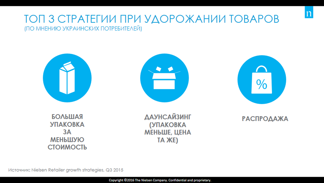 Чтобы выяснить, как потребитель адаптируется к постоянному повышению цен на товары в условиях низких зарплат, Nielsen попросил респондентов расставить в порядке приоритетности бизнес стратегии, которые производитель обычно применяет, когда повышает цену на свой продукт. Стало понятно, что самой предпочитаемой стратегией, по мнению, как украинских, так и глобальных потребителей стало предложение большей экономичной упаковки по меньшей цене. Стратегия скидок и промо-акций пользуется меньшей популярностью. Качеством продуктов ни украинский, ни глобальный потребитель жертвовать не готов.