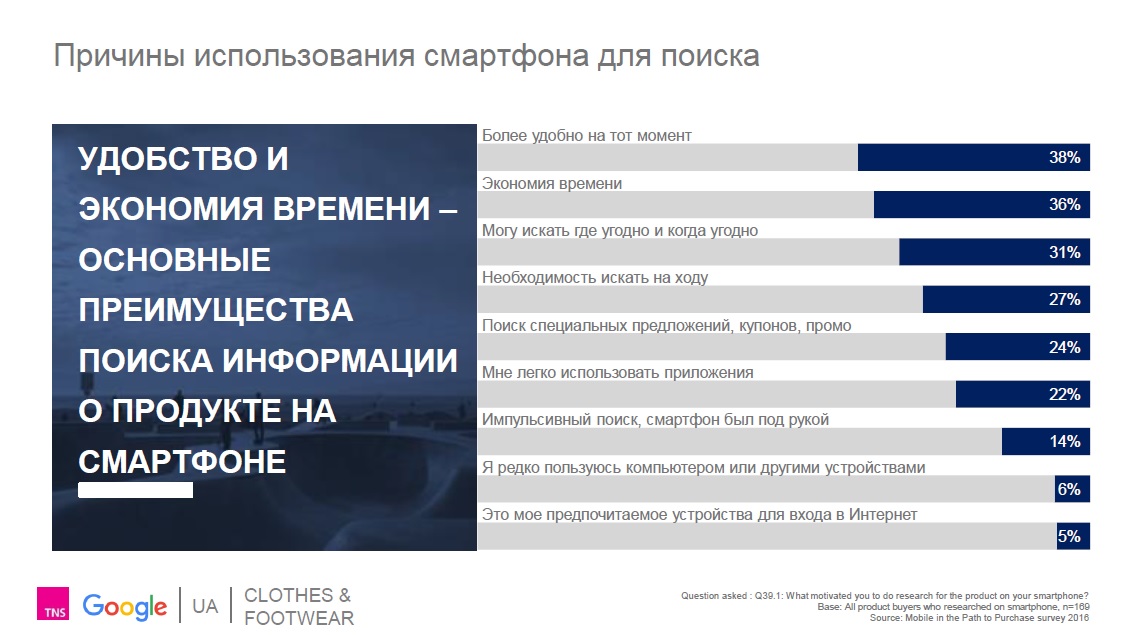 Для 38% украинских интернет-пользователей главным фактором использования смартфона для поиска информации перед покупкой является удобство, 36% считает, что смартфон помогает рационально использовать время, а 31% используют смартфон, потому что он всегда под рукой.