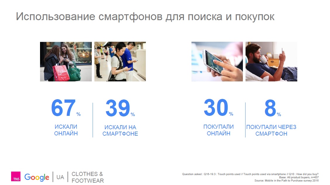 Предлагаем рассмотреть результаты данного исследования на примере категории товаров, которые мы все покупаем реже или чаще - одежда и обувь. Так, 67% украинских пользователей ищет информацию о товарах в Интернете перед покупкой, а 39% - ищут информацию с помощью смартфона. Из потребителей, которые совершили покупку - 30% сделали это через Интернет, а 8% - совершили покупку онлайн с помощью смартфона.