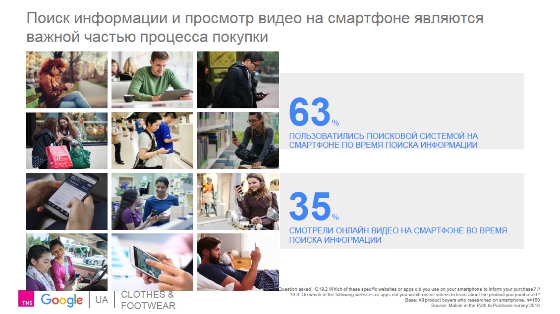 В целом пока поиск на компьютерах превалирует над поиском информации на смартфонах (58% против 29% в категории “Одежда и обувь”).  Однако исследование показывает, что онлайн-поиск и просмотр видео на смартфонах являются важными факторами в процессе покупки - перед покупкой одежды или обуви 63% украинских пользователей смартфонов использовали поисковые системы для сбора информации, а 35% смотрели онлайн-видео на смартфоне в процессе поиска. В категории средств по уходу за кожей эти цифры даже выше - 85% и 57% соответственно, а перед покупкой лаптопов уже 91% украинских пользователей искали информацию через поисковые системы и 75% - смотрели онлайн-видео.