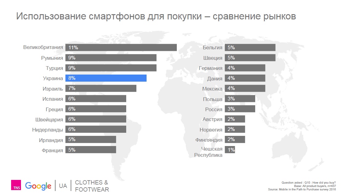 Если сравнивать с другими странами, то касательно поиска информации на смартфонах, Украина находится на уровне других европейских стран (в лидерах здесь Турция - 69%, Мексика - 68% и Испания - 62%), а в использовании смартфонов для покупок одежды и обуви  - даже опережает многие страны (здесь впереди Великобритания -11%, Румыния и Турция - по 9%).