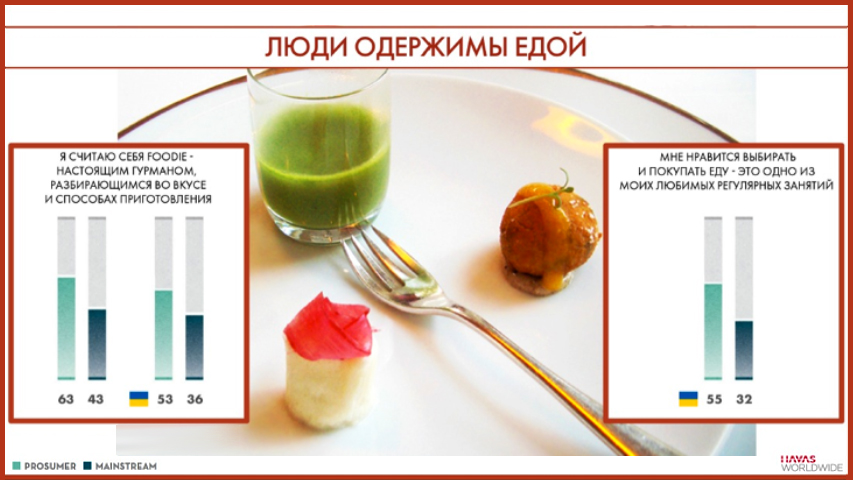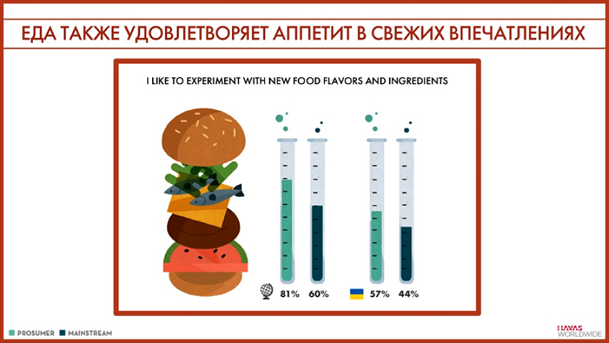 53% украинских прозьюмеров считают себя гурманами, для 55% покупка продуктов питания является одним из любимых развлечений. 53% украинских прозьюмеров выбирая между сексом и ужином в хорошем ресторане, отдадут предпочтение ресторану. Новинки также удовлетворяют аппетит в разнообразии - 55% украинских прозьюмеров любят экспериментировать с новыми рецептами и ингредиентами.