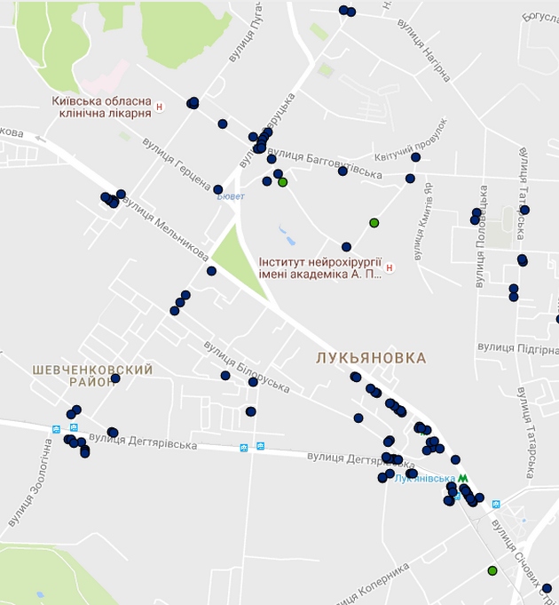 Кроме того, следует отметить, что данные портала КГГА часто не совпадают с реальными объектами даже по учтенным ВС. Например, в районе станции метро Лукьяновская на месте заявленных точек по торговле продуктами питания находятся ломбард, канцтовары и косметика (рис. 3). Данные объекты также формально являются незаконно установленными, поскольку, согласно Порядку о размещении временных сооружений, в случае изменения эстетической формы ВС его собственник обязан обратиться в соответствующий орган и утвердить изменения.
