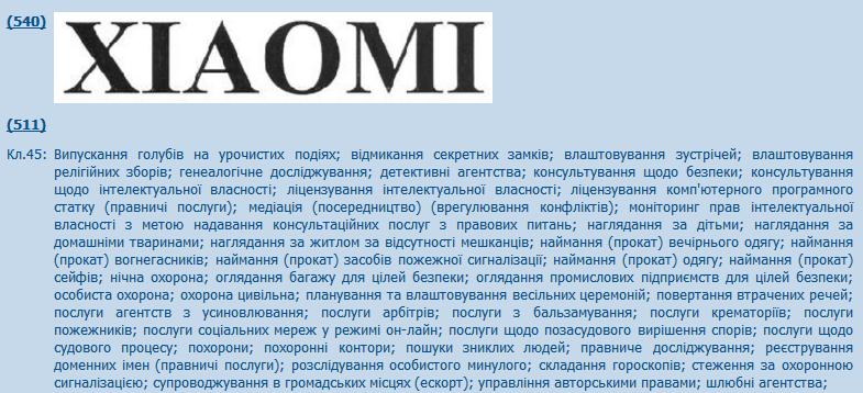 Компания NIS не владеет правами на бренд в Украине. Но торговые марки Xiaomi, Mi по некоторым классам товаров и услуг оформлены на ее совладельца и генерального директора Александра Ширкова (и с недавнего времени на некую Concord trade Inc. из США). Эти классы не предназначены для торговли гаджетами. Например, одна из зарегистрированных партнерами ТМ в Украине распространяется на класс 45. Он предусматривает проведение таких мероприятий, как, например, выпуск голубей на торжественных событиях. Другая ТМ Xiaomi предназначена для класса 37 — ремонт устройств.