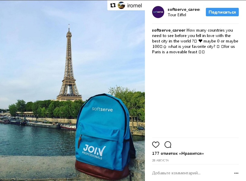 Похожая история у украинской IT-компании SoftServe. Instagram-аккаунт не помогает компании продавать свои услуги, но помогает продавать себя потенциальным сотрудникам.