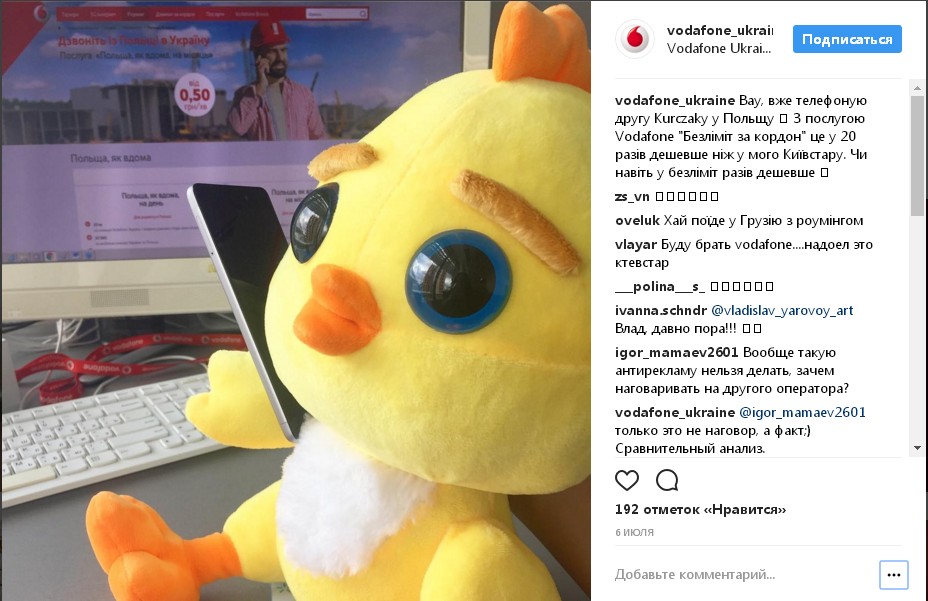 Хотя, как можно заметить, аккаунт "для души" иногда аккуратно помогает и делу. Например, первым постом в новеньком аккаунте стала фотография стартовых пакетов Vodafone, которых еще не было в продаже. Теперь в нем можно найти самый разный контент: от моментов офисной жизни до шуточных фотографий, на которых цыпленок Цыпа, герой рекламы конкурентного оператора Киевстар, тестирует услуги Vodafone.