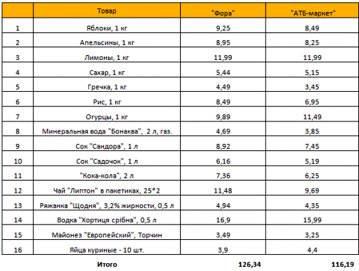 Если взять сумму цен товаров с таблицы, то общая сумма покупки на 16 выбранных товаров составляет 126,34 грн в “Форе” и 116,19 грн - в “АТБ”. Стало быть, делать покупки в «АТБ» на 9% дешевле чем в «Форе».