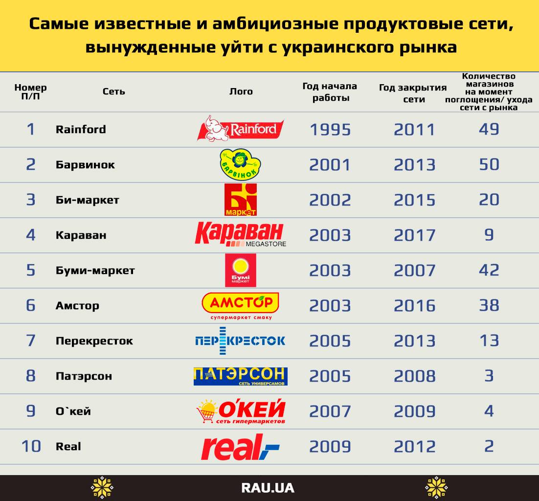 Причина исчезновения ряда других брендов банальна: поглощения более удачливыми конкурентами. Так с карты сетевой продуктовой розницы Украины исчезли Барвинок, Би-маркет, Буми-маркет, Караван и другие сети. Внутрикорпоративный конфликт и начало вторжения пророссийских сил в Донбасс привел к «скоропостижной смерти» розничного бизнеса компании Амстор. Сейчас на месте маркетов бренда открылись Сільпо, а сам Амстор существует только в виде торговых центров.