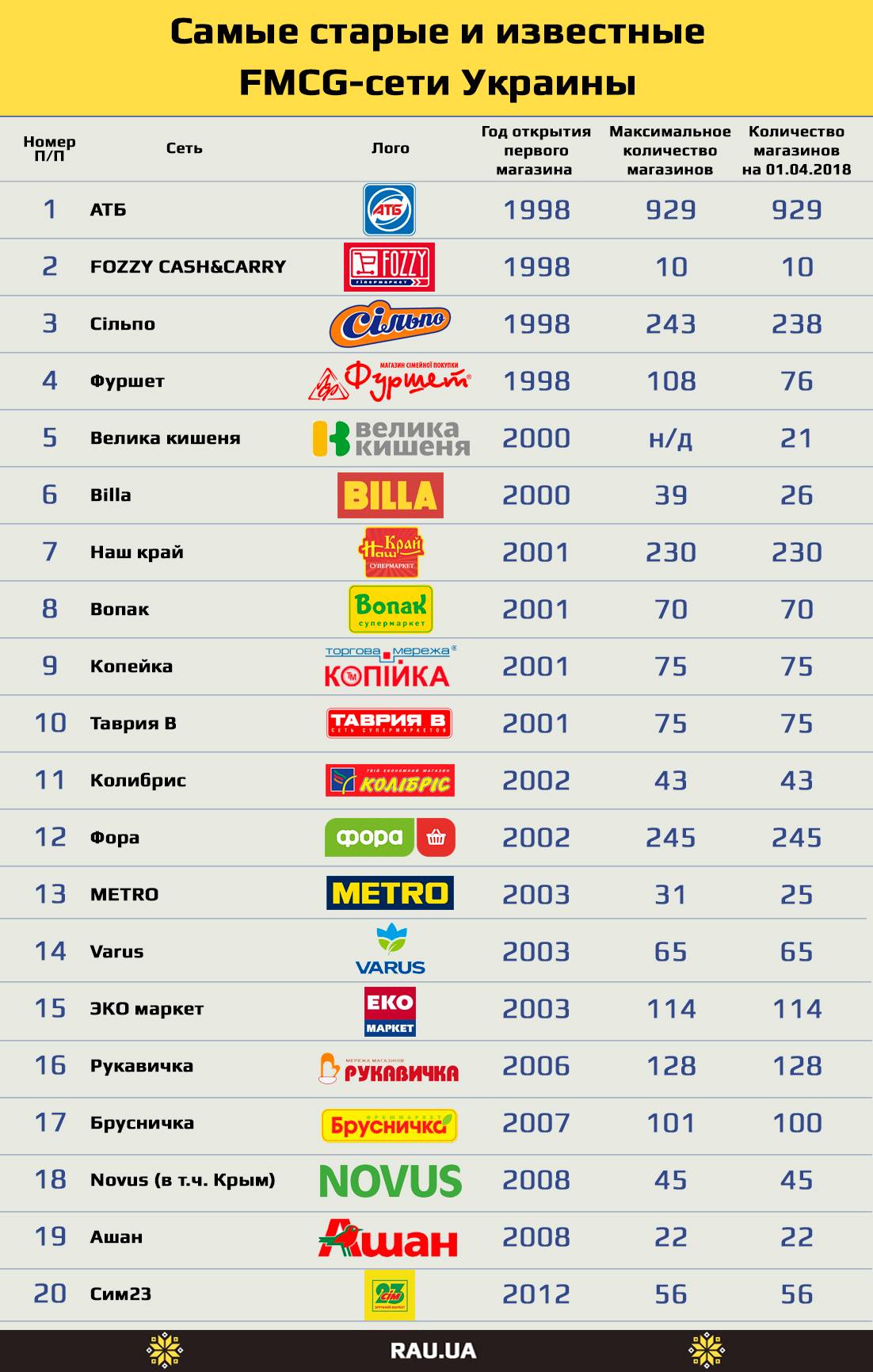 По данным исследовательской компании GT Partners Ukraine, сейчас в нашей стране работает около 140 продуктовых розничных сетей. Часть из них – небольшие локальные игроки, а часть – национальные гиганты с сотнями магазинов. Причем некоторые лидеры присутствуют на рынке уже без малого 20 лет! RAU проанализировала: какие ритейлеры начали выстраивать собственные торговые сети первыми, кто последовал за первопроходцами, и как сложилась судьба первых сетевых розничных компаний.