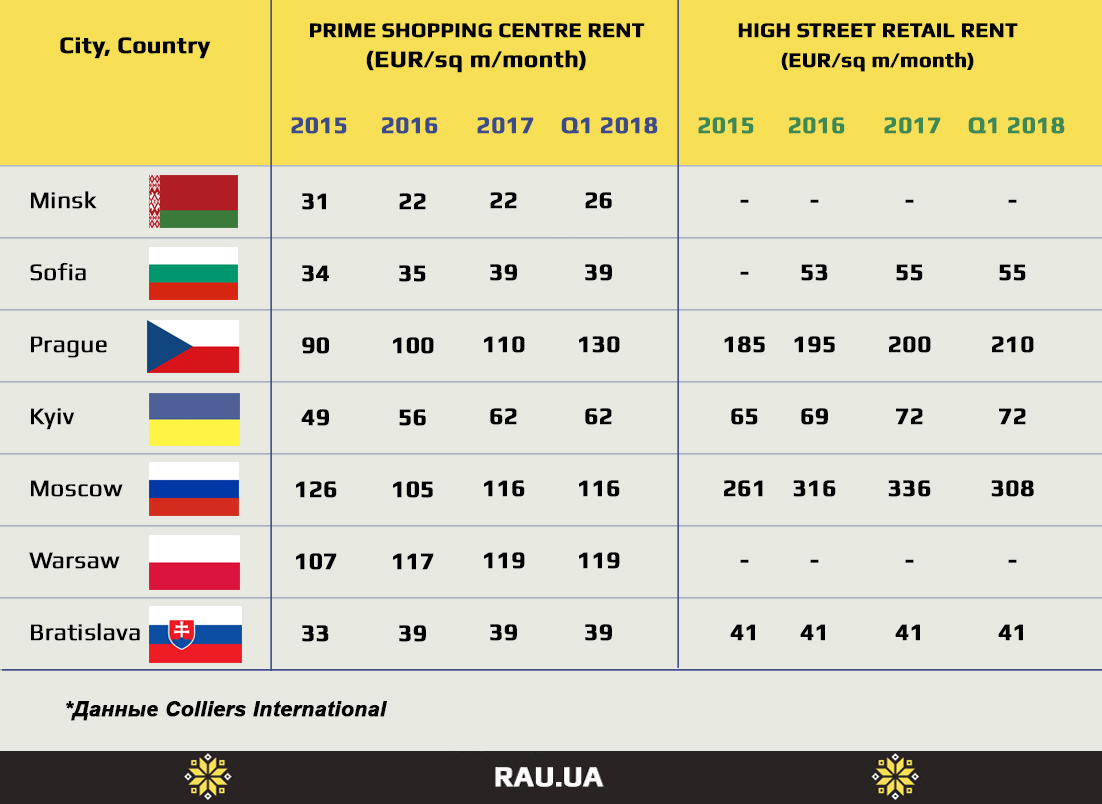 Что любопытно, аналитики фиксируют относительно небольшой рост ставок в последние годы. По информации консалтинговой компании JLL за последние четыре года (I квартал 2018-го к I кварталу 2015-го) максимальная арендная ставка в торговых центрах Киева выросла на 21% — с $840 до $1020 за кв. м в год, не включая операционные расходы и НДС. По данным Colliers International, за последние 12 месяцев в лучших торговых объектах Украины наблюдается рост арендных ставок в среднем на 5%.