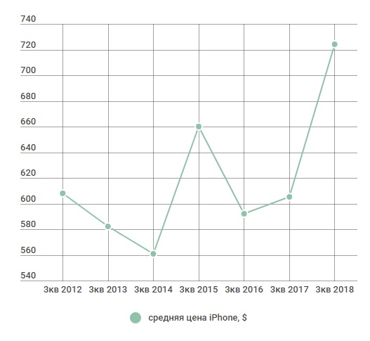 $724 - это к тому же самая высокая средняя стоимость устройства Apple, начиная с 2012 года. Заметно увеличивать этот показатель компании из Купертино удавалось в 2015 году. Тогда в 3Q средняя стоимость гаджета составила $660. Нужно сказать, что тот период был рекордным для Apple не только по средней цене, но и по другим параметрам. В частности, доход в Q3 2015 вырос на 59%, а объем продаж в штуках - на 35%.